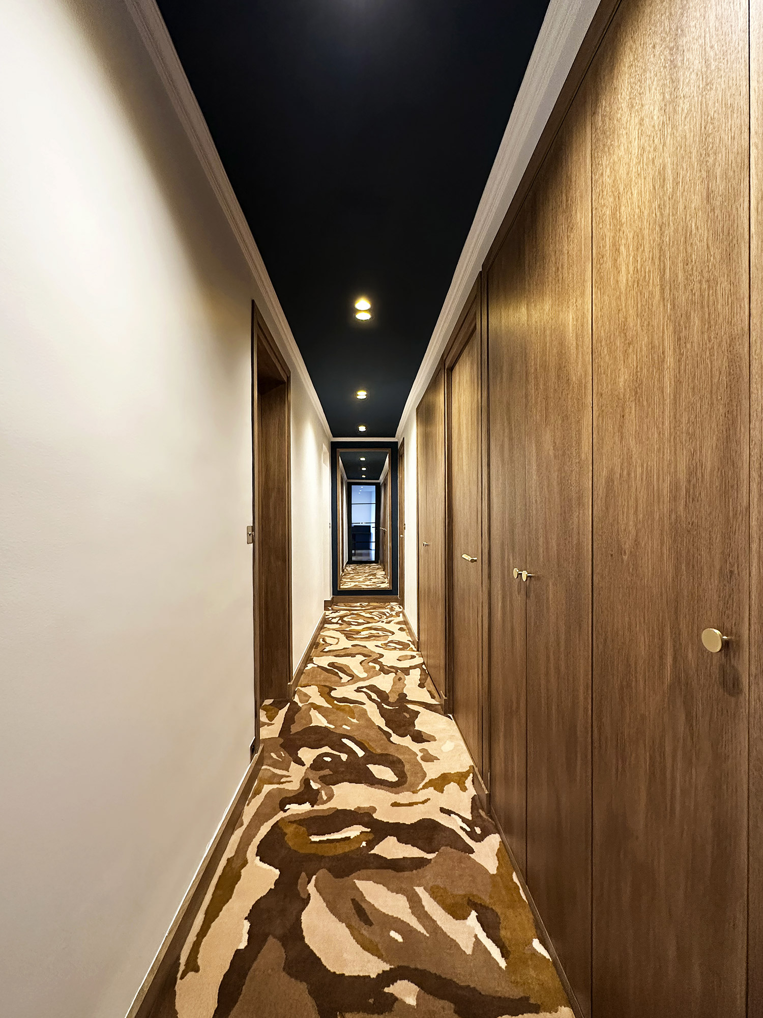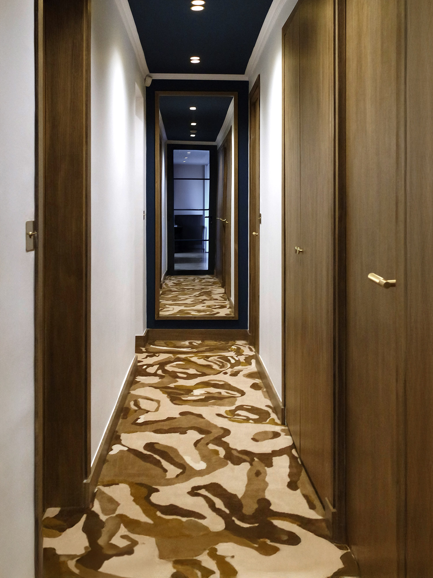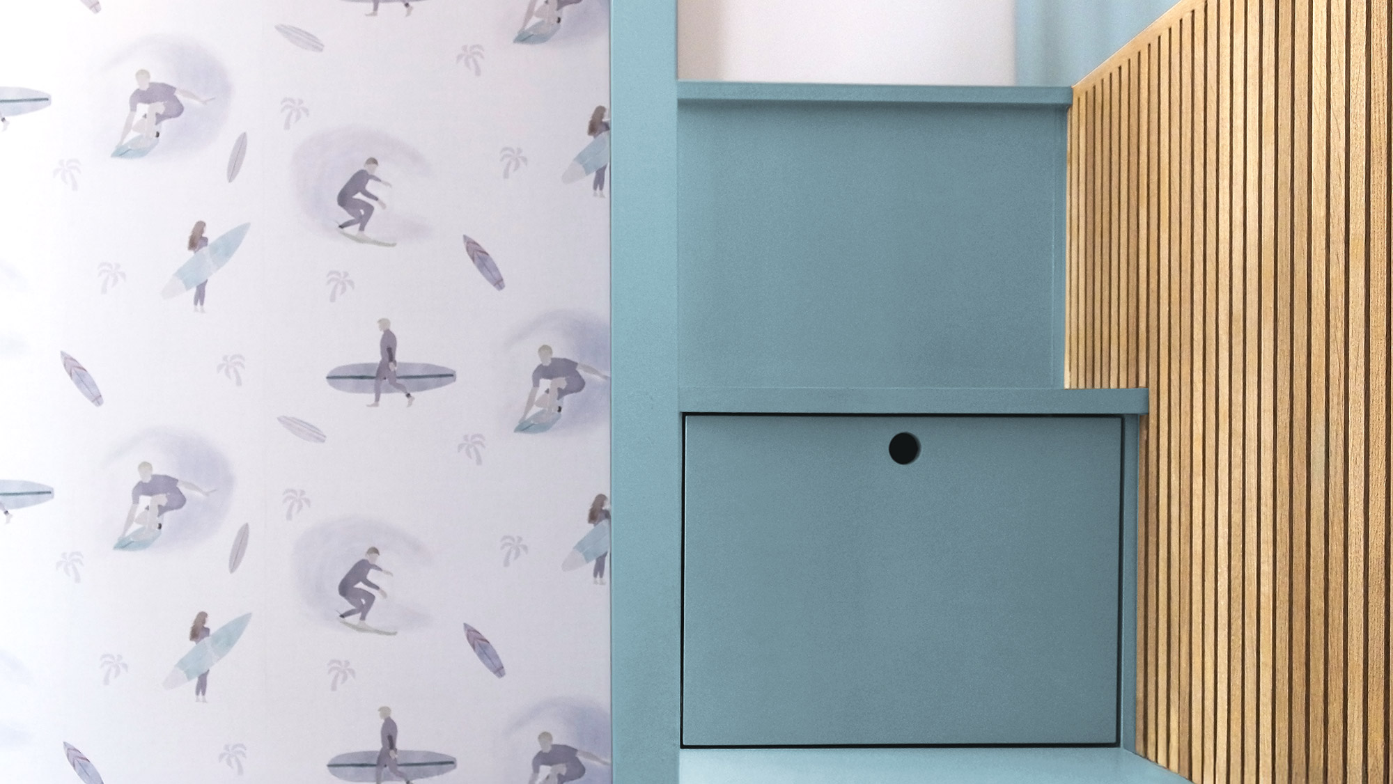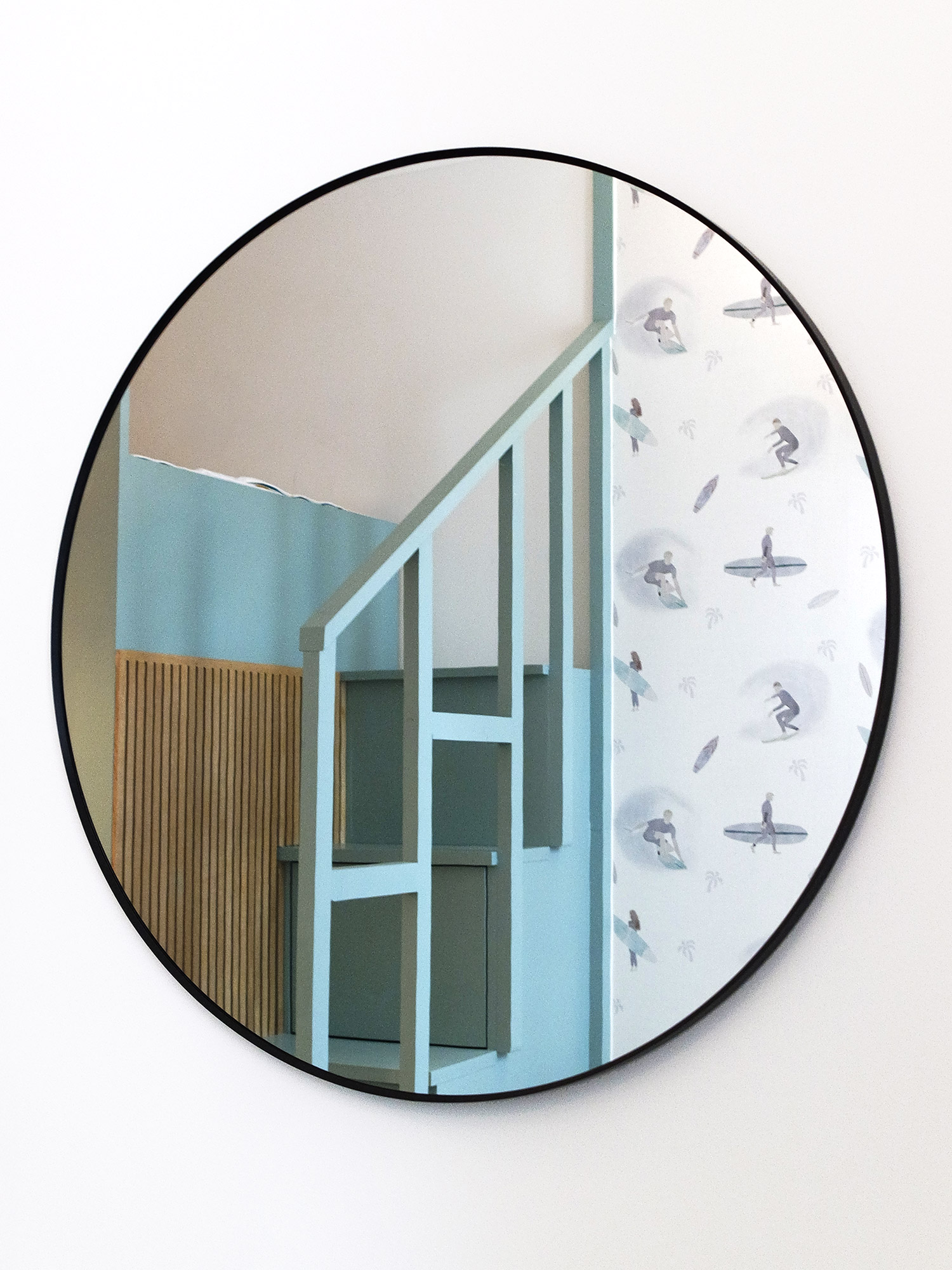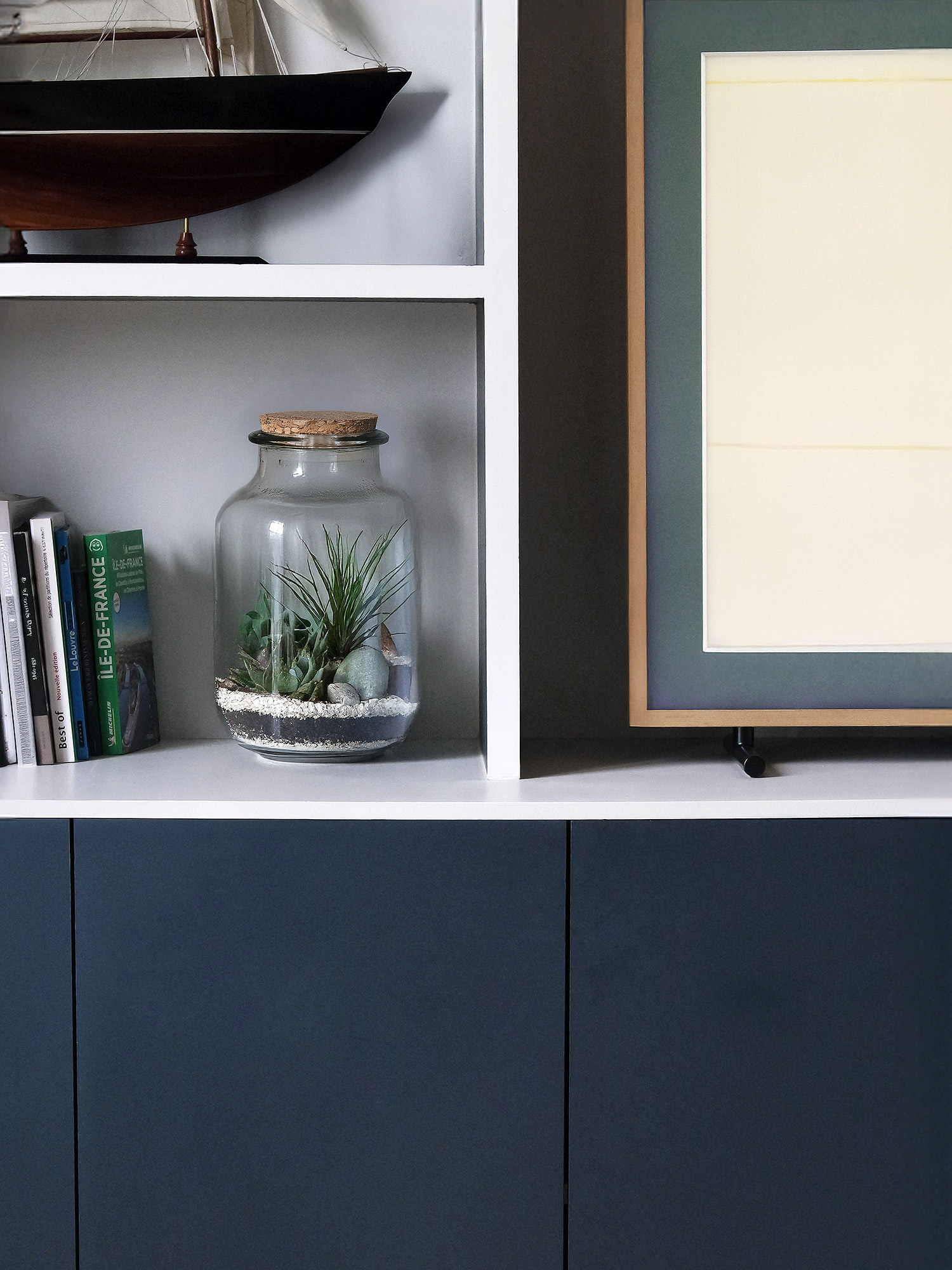 Un trait doux reliant les pièces de vie aux teintes bleues et noires,